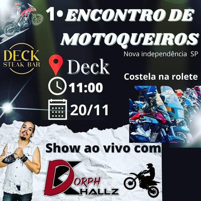 A cidade de Nova Independência sedia neste domingo (20), a partir das 11h, seu primeiro encontro de motociclistas com ponto de concentração no Deck Steak Bar, localizado na principal avenida do município: Av. Eurico Soares Andrade, centro. Todos os motociclistas das regiões de Andradina e Dracena estão convidados.